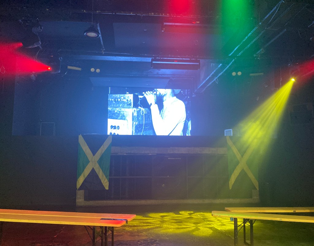 When I walk into the E1 venue in Wapping, it feels like an odd fit for a Shaka event. The main space is separated by large concrete columns, making it hard to congregate around a single focal point. The chic functional brickwork and steel beams contrast with the battered wooden speaker cabinets of Shaka’s (now, his son Young Warrior’s) sound system.