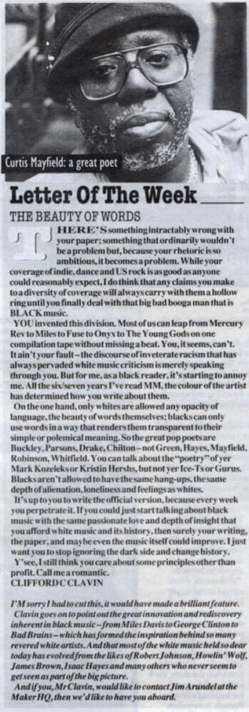 Neil started writing for Melody Maker after he wrote a devastatingly eloquent letter to the publication about how it was a white boys’ club and needed to up its game. I remember clocking the letter at the time. It was so confusingly superior to the other words around it, ones the publication had actually paid money for, that it seemed like it must be part of some kind of plant or scheme or conceptual prank. His truth was stronger than such fiction. MM to their great credit told him immediately to get in touch and get some work. In 2015, we experienced something a little similar at The Wire, when Daniel Neofetou filed a letter critiquing my review of the Bloc dance music festival, making several points I’d either missed or wished I had thought of, and Daniel started contributing to the mag as a writer soon after.